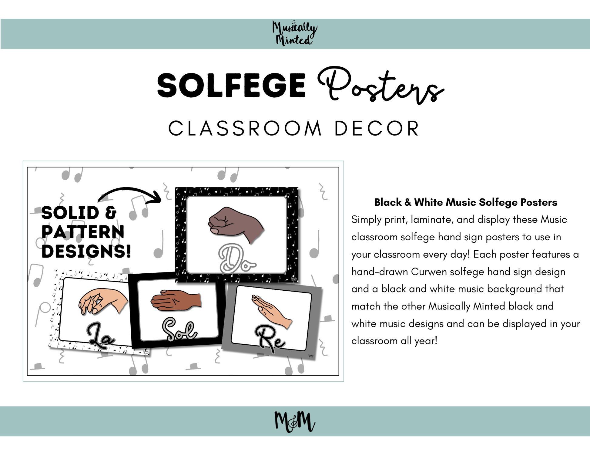 Add a meaningful and inclusive visual element to your music classroom with these Concert Black Solfege Posters! Featuring hand-drawn Curwen hand signs in a variety of skin tones, these posters reflect the diversity of your students while supporting daily solfege practice. Designed in a bold Concert Black color scheme, they coordinate perfectly with other Musically Minted classroom decor.