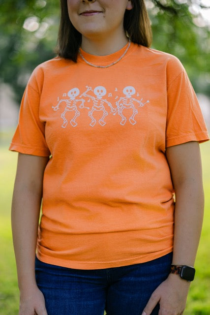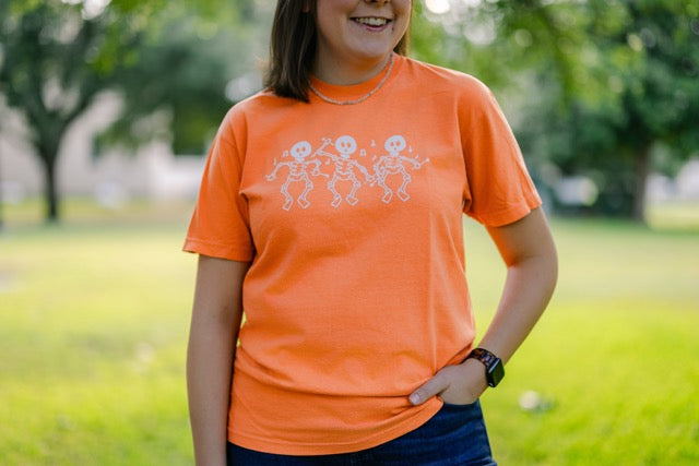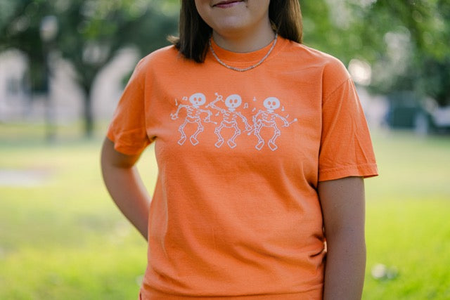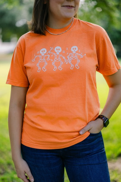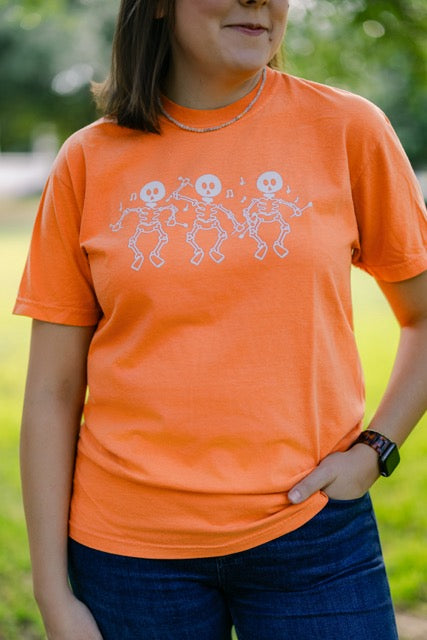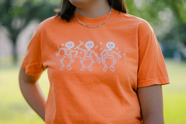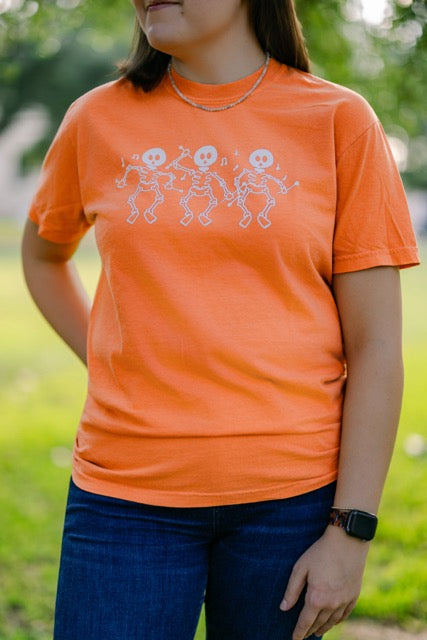 This best selling "Marimba Skeletons" design is back and better than ever on a bone-chilling burnt orange for lovers of all thing spooky!! This is the perfect Halloween shirt for all things Halloween.