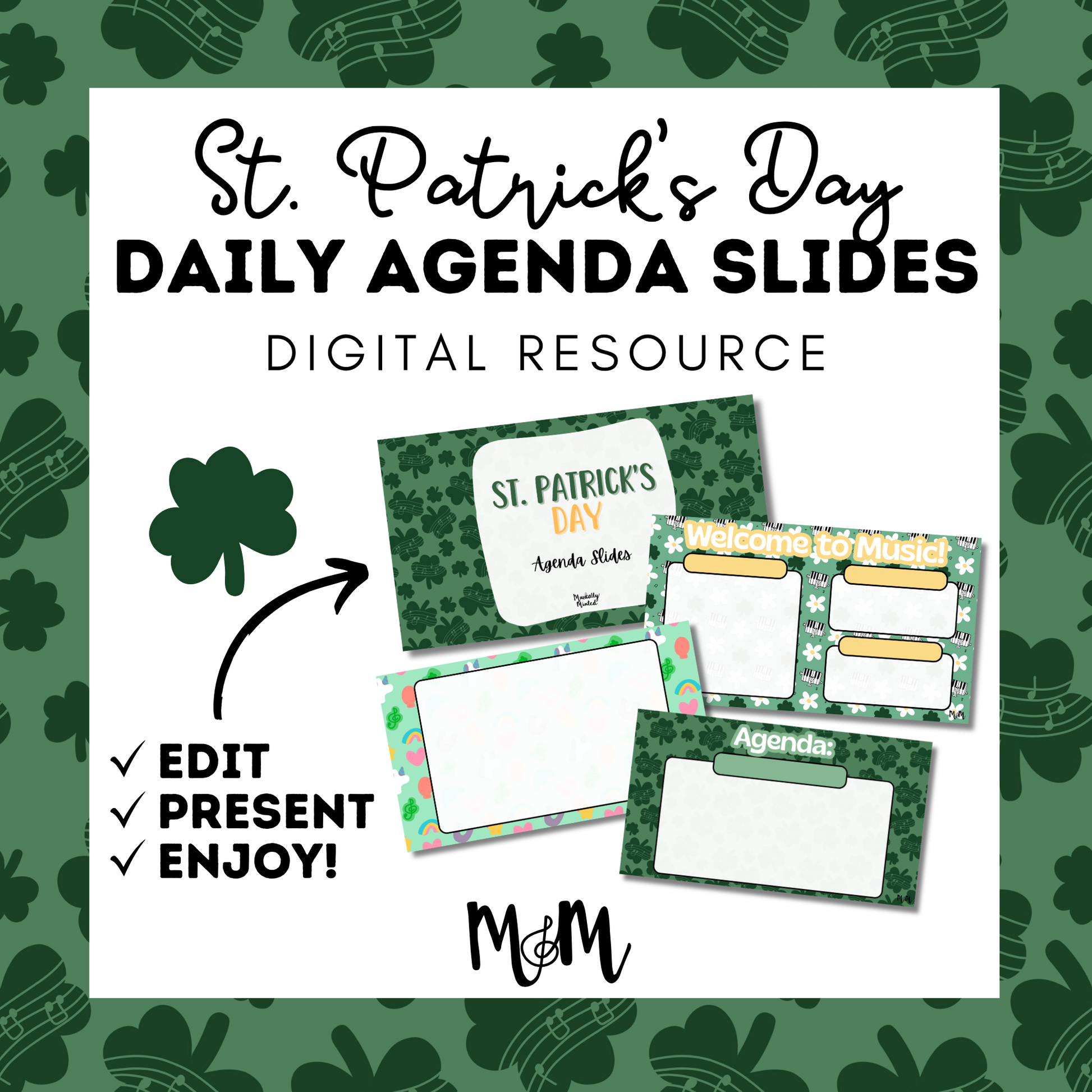 These festive and editable Google Slides are perfect for Music teachers who want to stay organized while celebrating St. Patrick’s Day. Featuring shamrocks, rainbows, gold coins, and playful green accents, these slides make it easy to display your daily agenda, objectives, reminders, and announcements in a bright and engaging way.