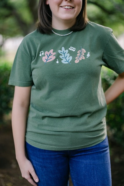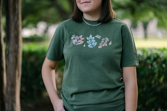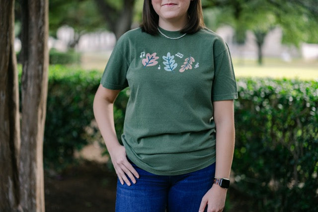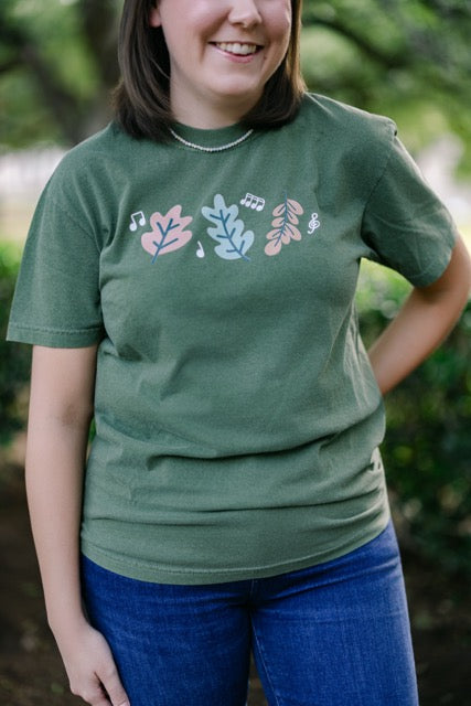 If your fall days look like feeling the warmth of a bonfire, watching the leaves fall, and listening to the wind flicker in and out of the trees, you'll need this Autumn Leaves shirt in your wardrobe. Perfect for a pumpkin patch or just cozying up at home, this shirt ties in a subtle touch of music to the crisp autumn season.