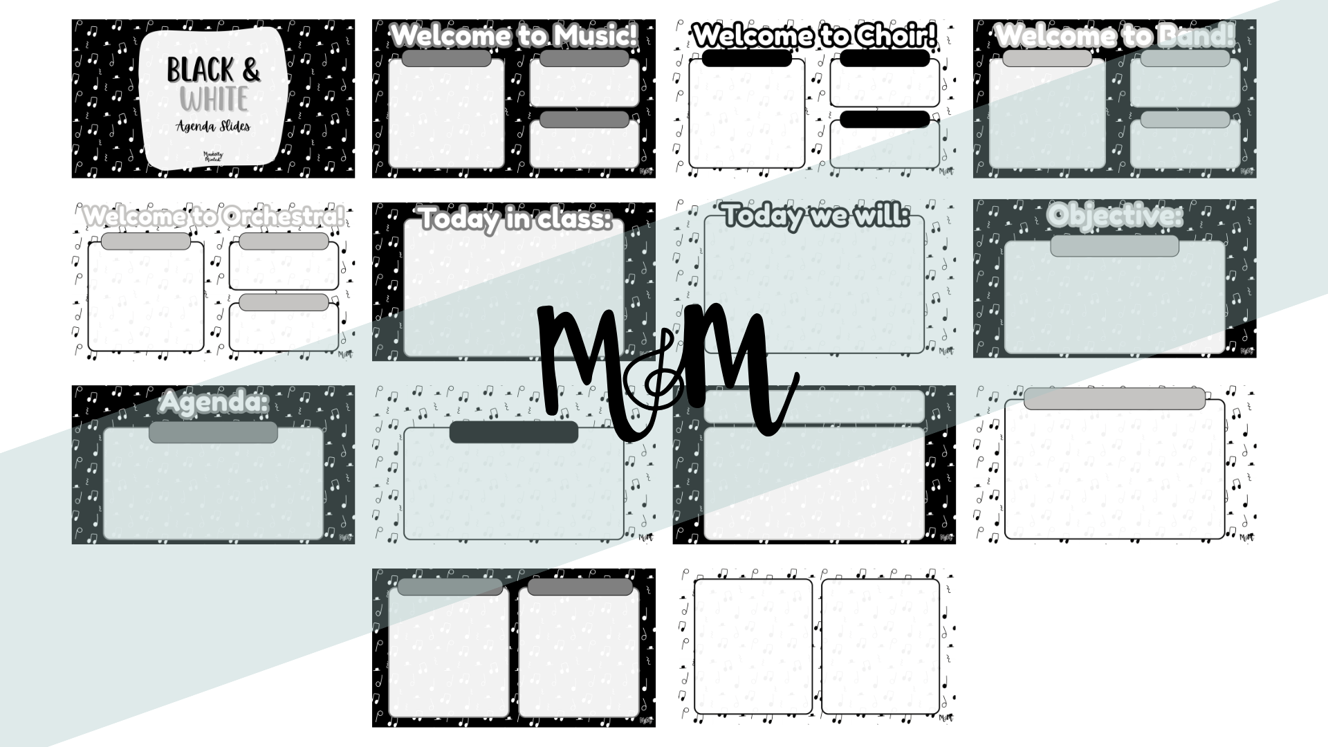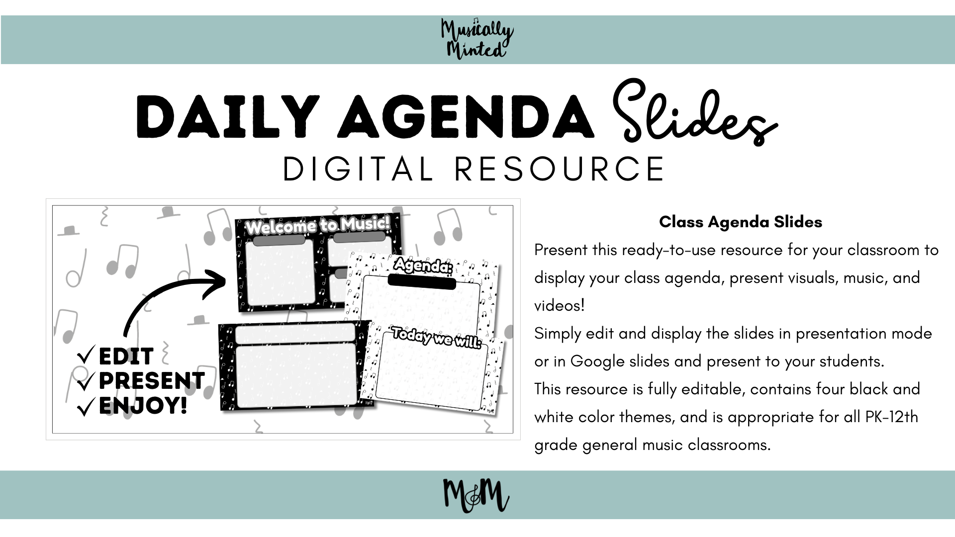 Bring structure, clarity, and style to your music classroom with these Concert Black Daily Agenda Google Slides! Designed using the signature Musically Minted hand-drawn, classic Concert Black theme, this easy-to-use Google slides presentation resource helps you display daily objectives, agendas, and multimedia content that are perfect for any music classroom, grades PK–12.