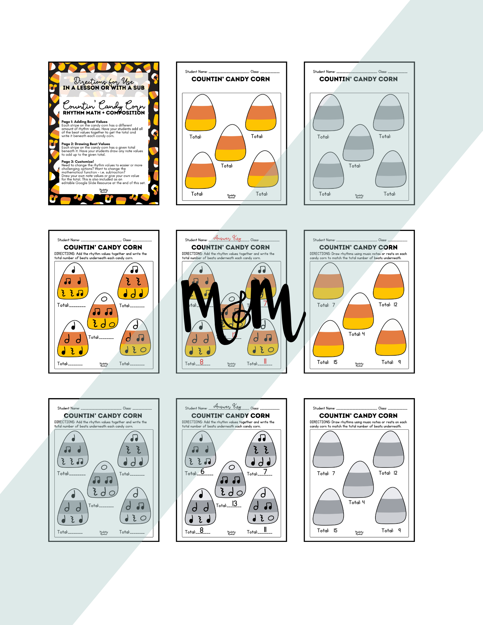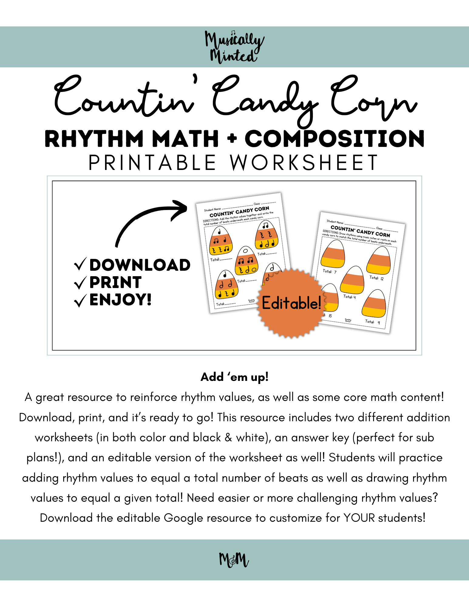 🎶 Challenge your students with this Rhythm Math Addition Worksheet - Candy Corn Edition! A fun and engaging Halloween or fall music activity for elementary or middle school students! This printable worksheet features a festive candy corn design while reinforcing note values of quarter notes, quarter rests, half notes, whole notes, and quarter rests. Also included is an editable worksheet to customize for your students' needs!