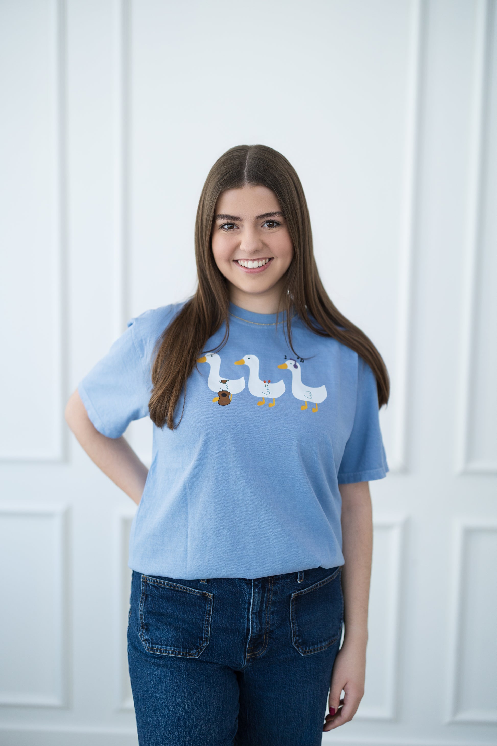 Duck, duck, GOOSE! The people have spoken...we needed the musical geese on a shirt! This Silly Goose Trio design is hand-drawn with geese donning a ukulele, percussion mallets, and headphones for the ultimate jam session. Wear your silliness with pride and join the silly goose gaggle in this super comfy tee.