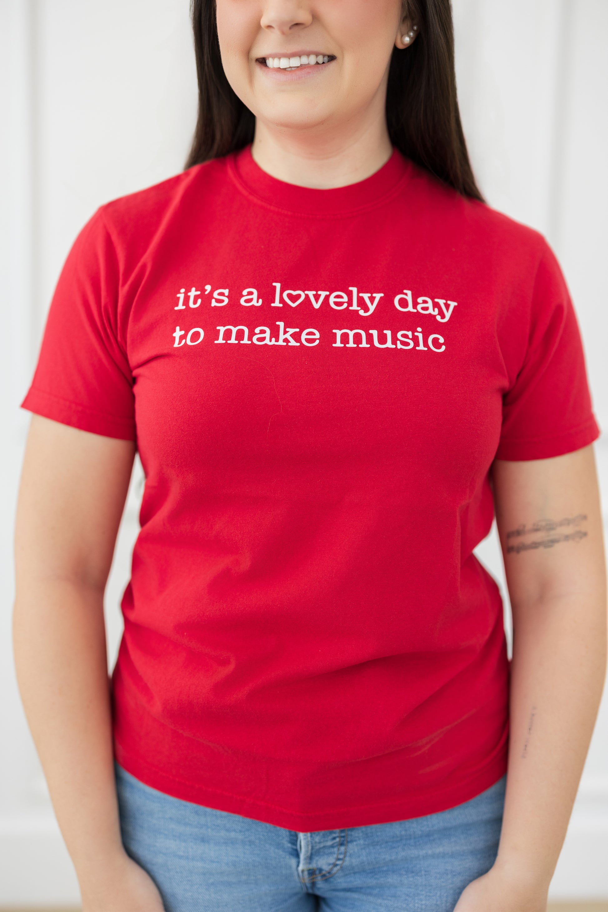 A Valentine's Day spin on one of our classic t-shirt designs! This shirt can really be worn year round because every day is a lovely day to make music. We especially love the little heart detail in the word 'lovely' :)