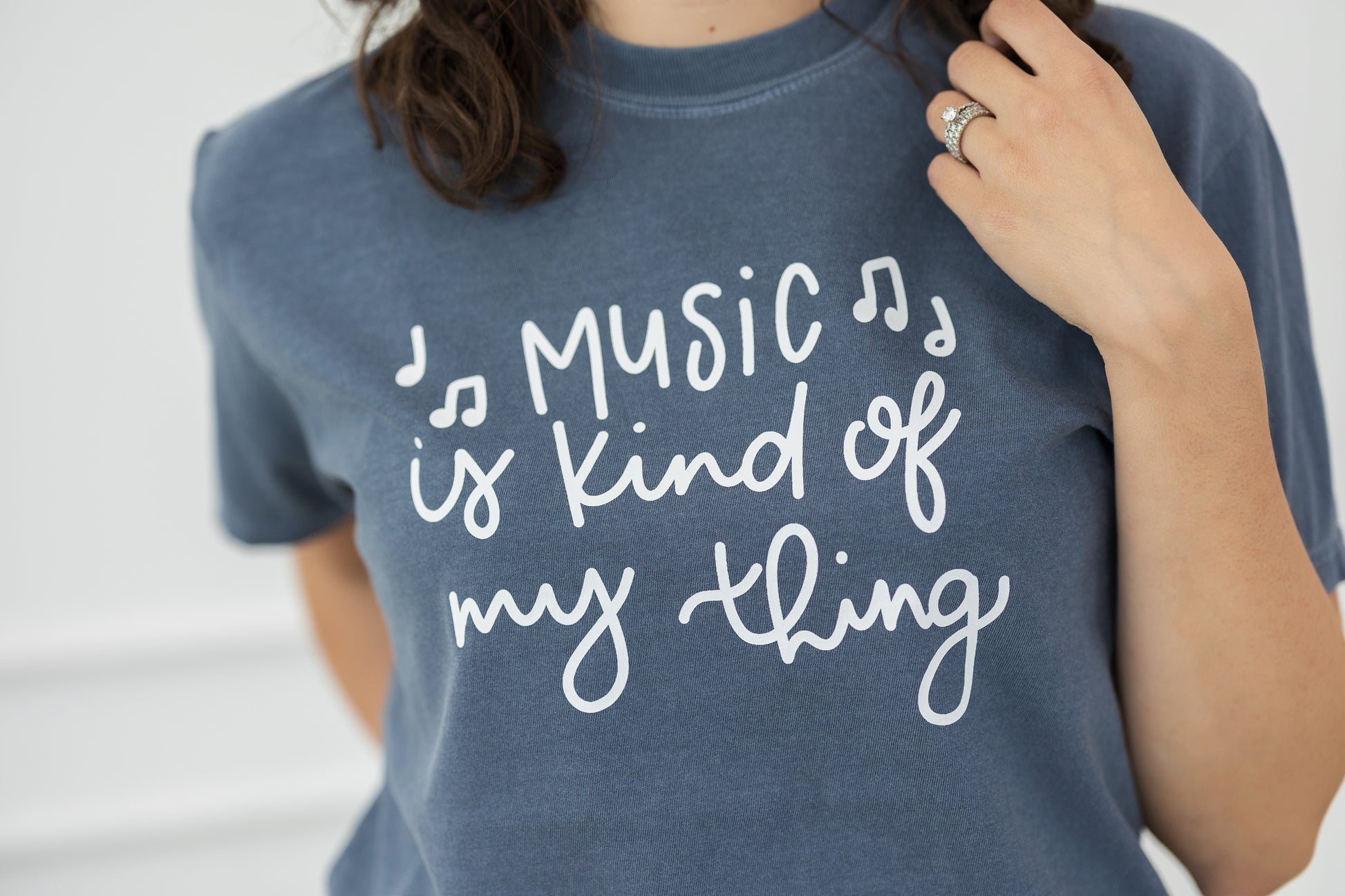 This Comfort Colors T-Shirt is very comfortable, pre-shrunk and has unisex sizing. The Music Is Kinda My Thing design is screen printed in-house with high quality materials. When washing, flip shirt inside out, wash on cold and dry using low heat or hang. DO NOT use fabric softeners.