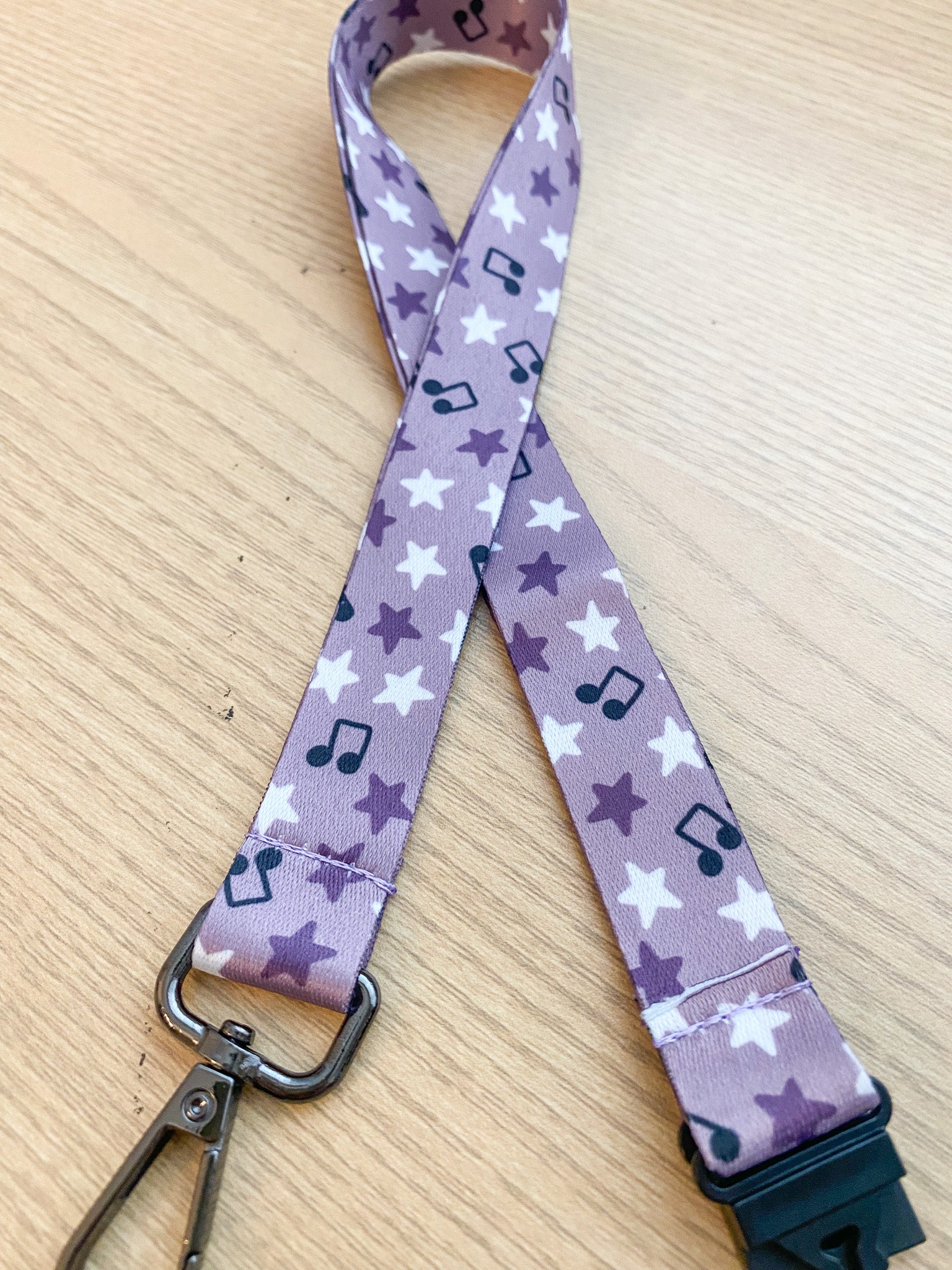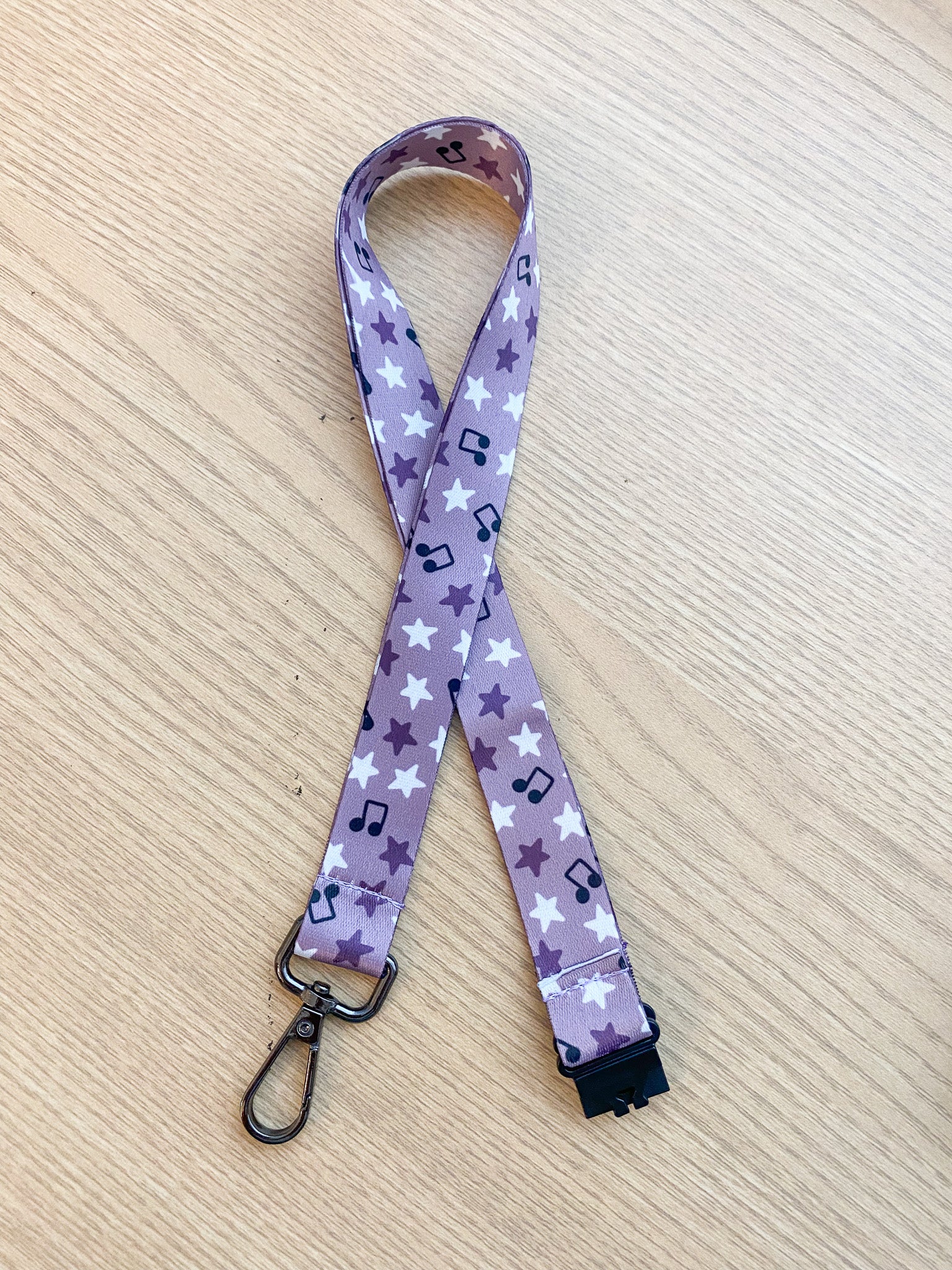 When the purple rain and purple haze shift out of sight, you’re left to look at purple stars! This lanyard features dark purple and white stars with bold black music notes on a lavender background sure to please the purple lovers. Use it hold your keys or hall pass for a pop of purple everywhere you go.