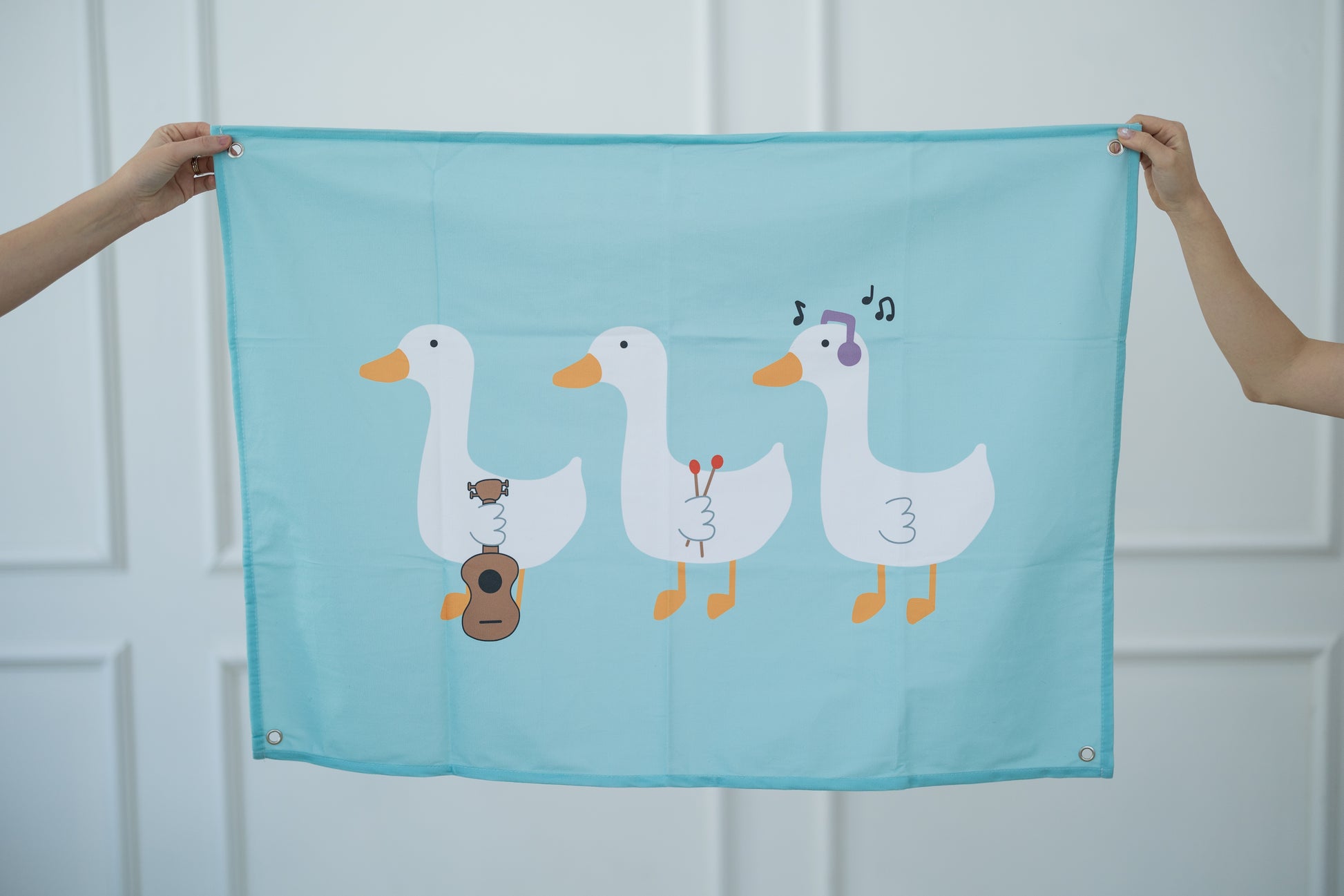 Duck, duck, GOOSE! The people have spoken...we needed the musical geese on a hanging tapestry! This Silly Goose Trio design is hand-drawn with geese donning a ukulele, percussion mallets, and headphones for the ultimate jam session.
