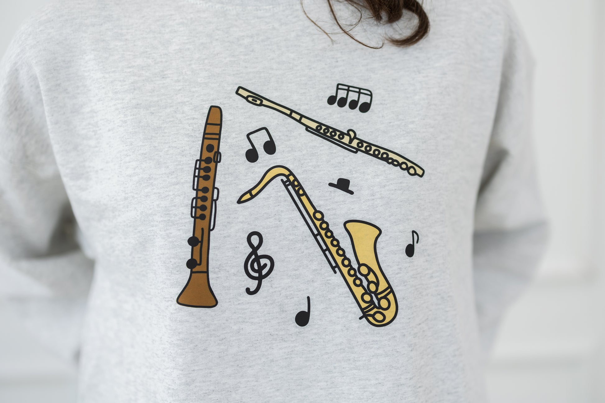 This cozy Woodwind Instruments Sweatshirt is calling for woodwind musicians and music lovers of all disciplines. Featuring a design celebrating saxophones, clarinets, and flutes, this sweatshirt will make onlookers fermata in their tracks. It's perfect to throw on for rehearsals, casual wear, or as a gift for any reed or woodwind player.